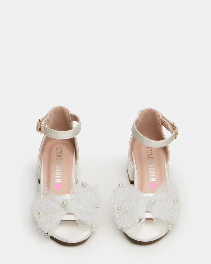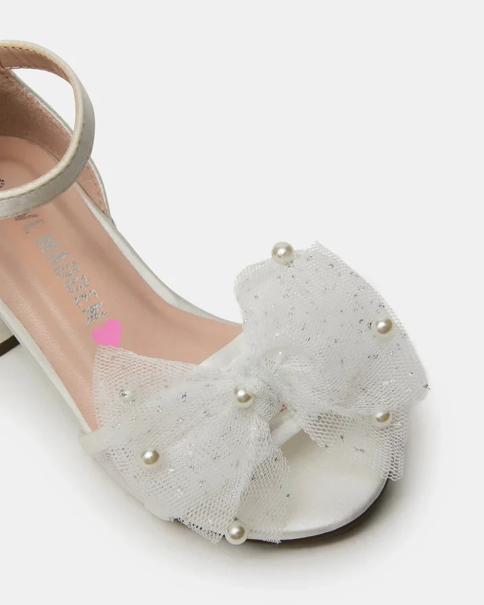 Découvrez la Debra White pour tout-petits, une sandale charmante conçue pour allier style et confort. Ce modèle raffiné présente une silhouette à bout ouvert avec une bride en maille respirante sur le pied, associée à un talon bloc robuste pour plus de stabilité et de maintien. La bride de cheville sécurisée maintient les petits pieds bien en place pendant les jeux actifs, tandis qu’un élégant nœud orné de perles ajoute une touche de sophistication. Parfaite pour les occasions spéciales ou pour un usage quotidien, cette sandale à talon allie une conception pratique à des détails raffinés que les parents et les tout-petits adoreront.Talon de 2,5 cm
