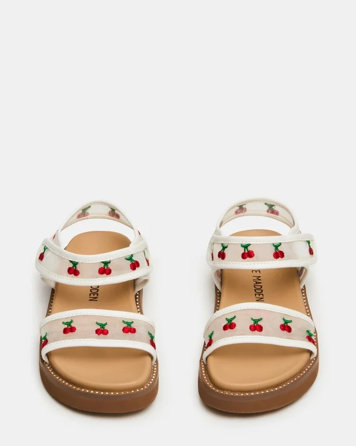 Découvrez la Lyla White pour tout-petits, une sandale ludique conçue pour les petits explorateurs. Dotée de charmants détails brodés en forme de cerise et d’une construction en maille respirante, cette sandale assure le confort des petits pieds tout au long de la journée. Les sangles Velcro réglables garantissent un ajustement sûr et personnalisable qui évolue avec votre enfant. Parfaite pour les aventures par temps chaud, des journées au parc aux sorties décontractées.