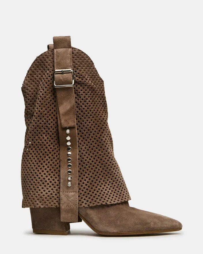 La botte Aubrielle en daim taupe offre une sophistication d’inspiration Style Western avec une silhouette à bout pointu saisissante et un revers spectaculaire. Les clous le long de la tige ajoutent une touche audacieuse et avant-gardiste qui rehausse l’esthétique traditionnelle. Le design structuré allie un style audacieux à une élégance facile à porter, ce qui en fait un choix idéal pour celles qui recherchent une version contemporaine des chaussures Style Western classiques. Parfaites pour les occasions où vous souhaitez vous démarquer ou pour un usage quotidien qui attire l’attention.