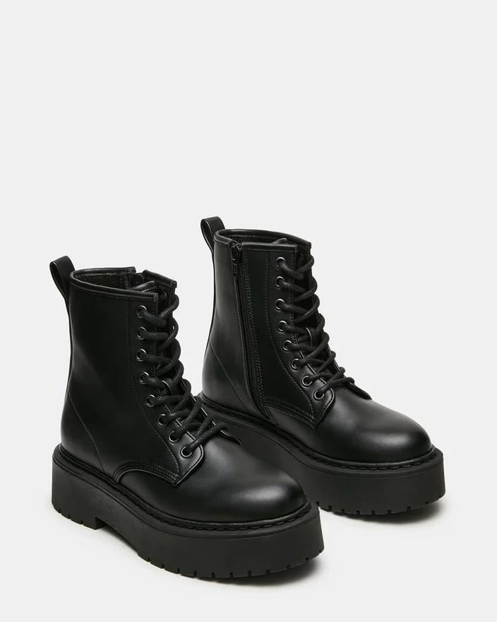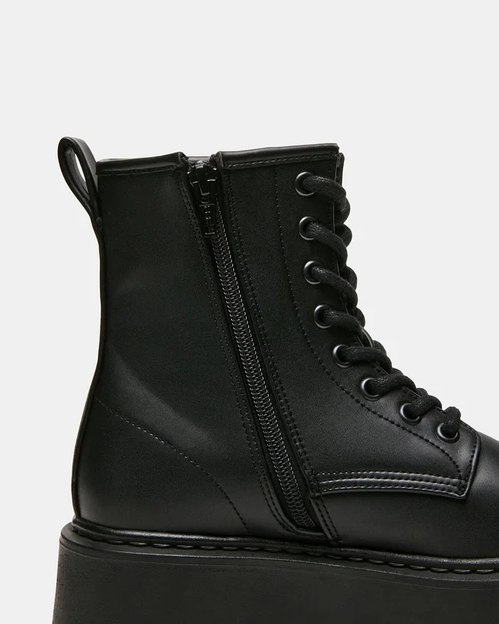 La bottine militaire Buffy Black offre un style raffiné. Cette bottine à lacets à hauteur de cheville présente une silhouette structurée qui attire l’attention, qu’elle soit associée à des tenues audacieuses ou à un jean. Le système de laçage sécurisé garantit un ajustement personnalisable, tandis que la semelle compensée apporte à la fois un impact visuel et une hauteur pratique. Conçue pour celles qui apprécient les chaussures audacieuses qui s’adaptent parfaitement du jour à la nuit, cette bottine allie attitude et polyvalence.