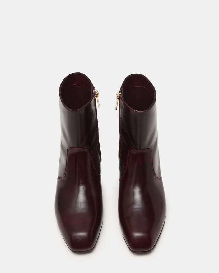 La bottine en cuir bordeaux de première qualité offre un style sophistiqué grâce à sa silhouette architecturale à bout carré et son talon bloc stable. Sa hauteur à la cheville permet une utilisation polyvalente au quotidien, passant sans transition du bureau à la soirée.