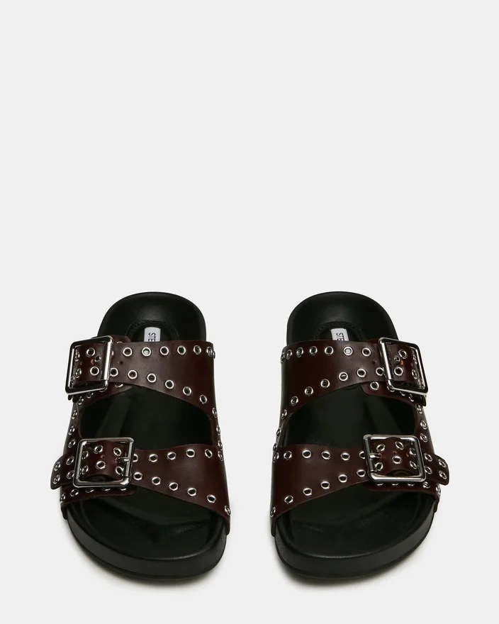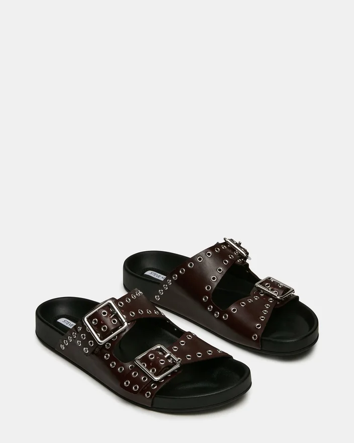 La sandale à enfiler Abott en cuir bordeaux allie une élégance discrète à un confort pratique. Des œillets finement travaillés ornent la tige, tandis que les deux boucles garantissent un ajustement personnalisable et sûr. La semelle intérieure offrant un bon maintien est conçue pour un usage prolongé, ce qui en fait un choix raffiné pour celles qui recherchent à la fois style et fonctionnalité dans leurs chaussures de tous les jours.
