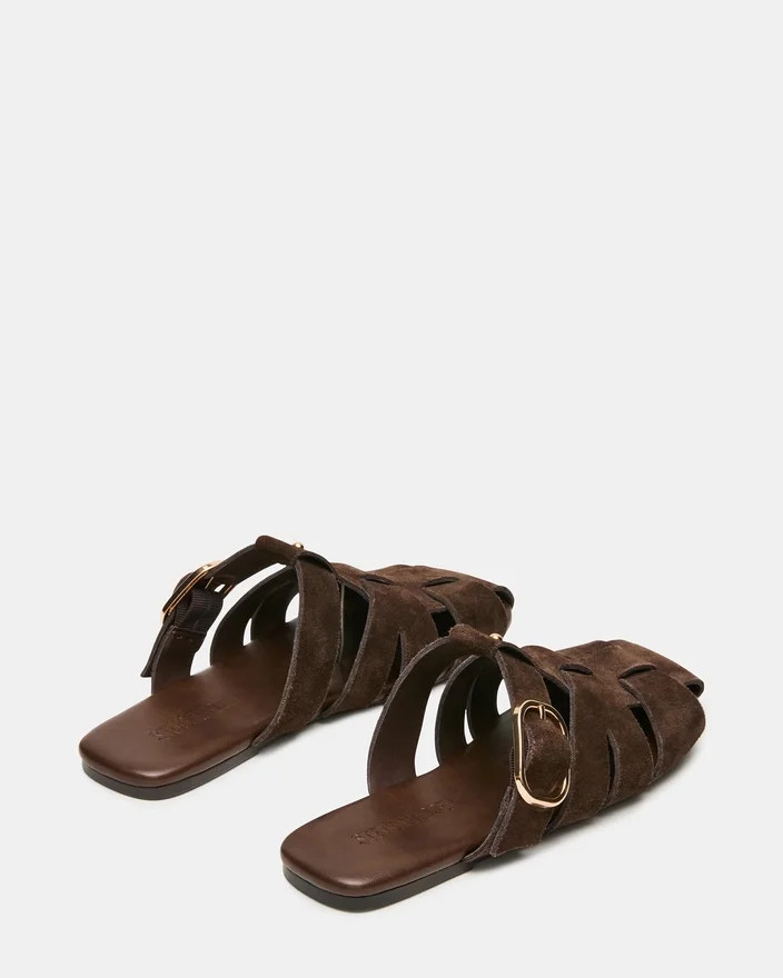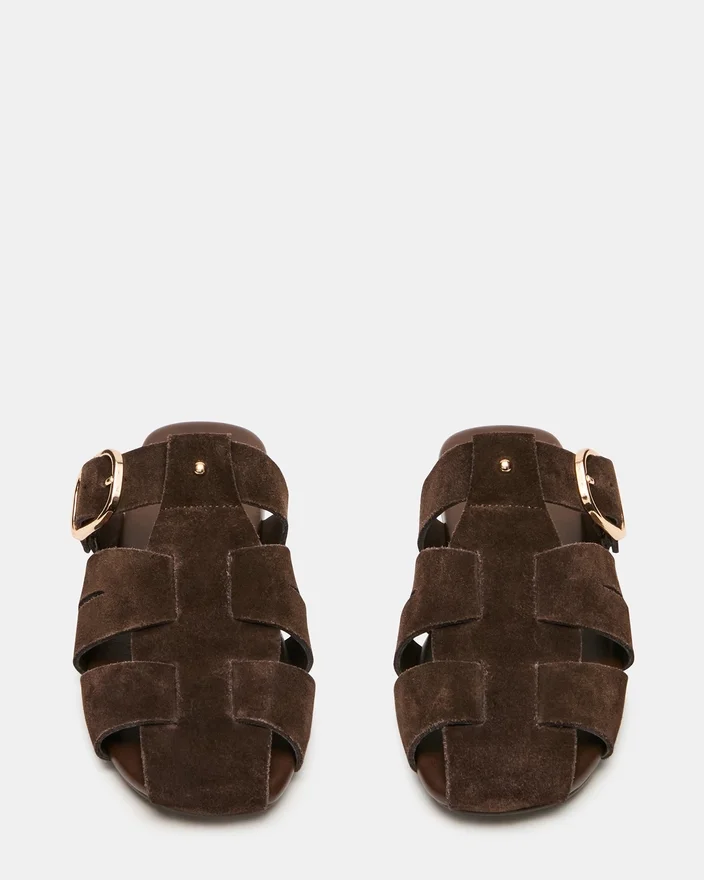 Le modèle en daim marron Halo présente un style pêcheur distinctif avec un design en cage qui apporte un intérêt visuel et un bon maintien. La bride à boucle réglable permet un ajustement sur mesure, tandis que la semelle plate vous assure un confort tout au long de la journée. Cette silhouette de mules offre la commodité d’un enfilage facile sans sacrifier le style, ce qui en fait un ajout polyvalent à toute garde-robe.