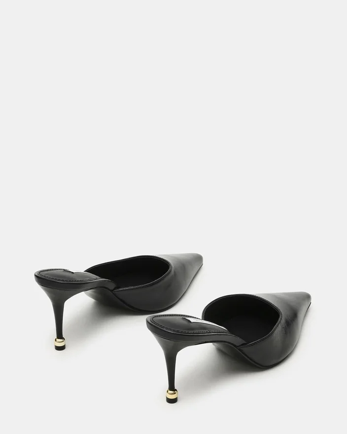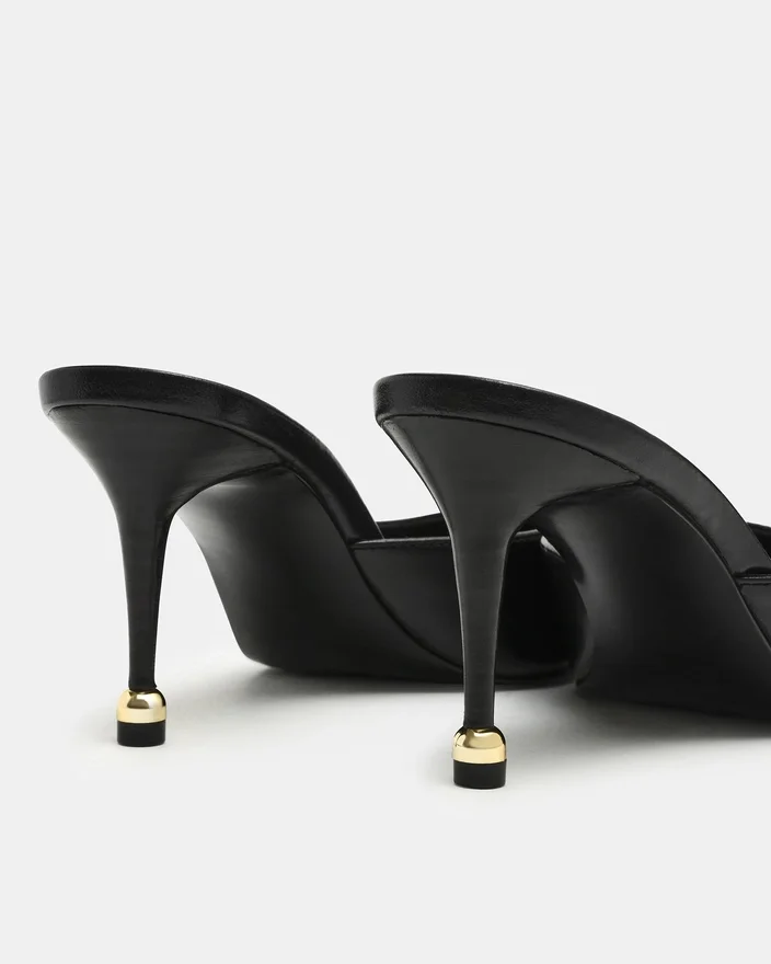 L’Adeline en cuir noir est une mule élégante dotée d’un bout pointu et d’un talon raffiné doré pour un look de tous les jours rehaussé. Son design offre une polyvalence stylistique sans effort, permettant de passer sans transition du bureau à une tenue de soirée. Un incontournable sophistiqué qui allie confort et élégance contemporaine.
