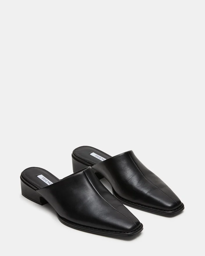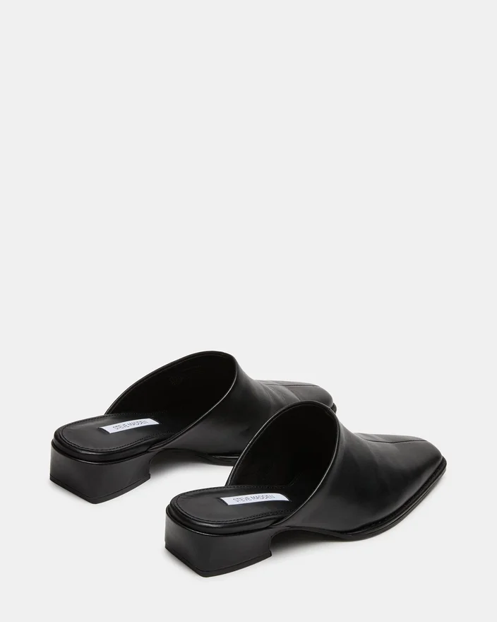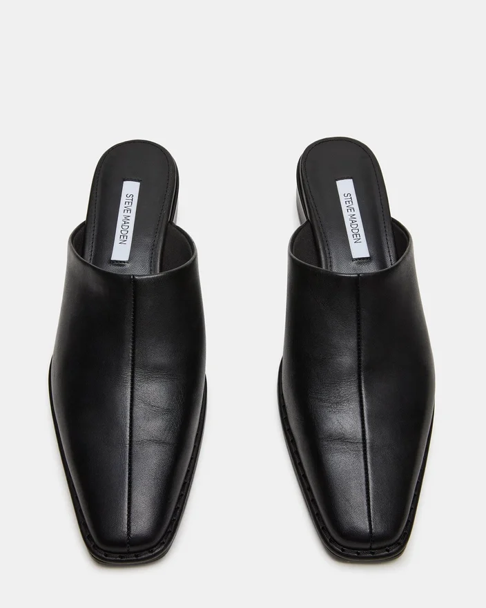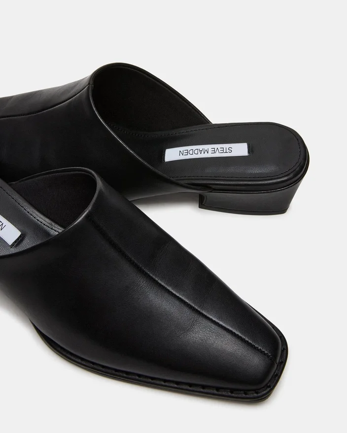 La mule Dessa en cuir noir allie une élégance discrète à un confort pratique, avec une silhouette à bout carré qui met le pied en valeur tout en conservant une esthétique contemporaine. Cette chaussure plate offre un soutien et une stabilité fiables, ce qui la rend idéale pour une utilisation quotidienne ou pour les occasions en soirée.