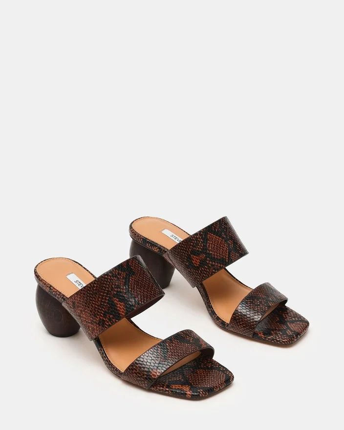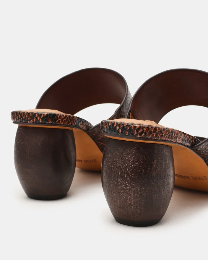 Optez pour un style décontracté avec les Nola Brown Snake. Ces mules modernes présentent un bout carré distinctif et un talon bloc robuste pour un confort et une stabilité tout au long de la journée. Des lanières épaisses et offrant un bon maintien maintiennent votre pied en place tout en vous donnant un look audacieux et contemporain. Parfaites pour passer de la journée à la soirée sans effort.