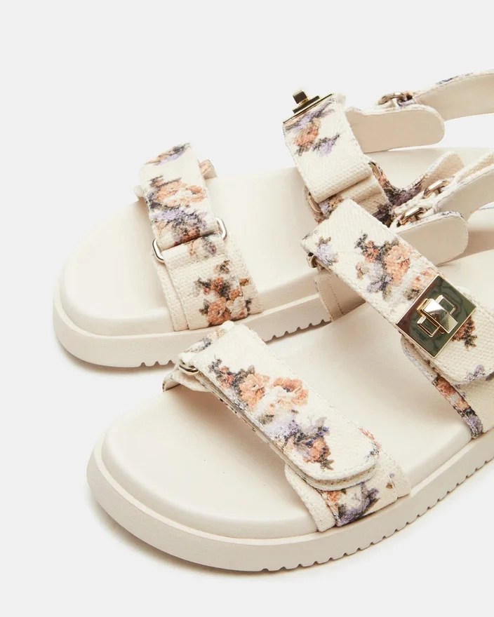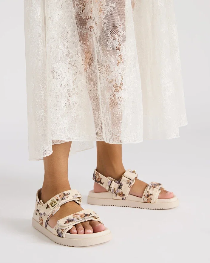 Le modèle Mona reprend le design classique de la sandale à trois lanières avec une semelle moulée et une semelle plate, et le rehausse grâce à une construction durable et des finitions dorées robustes.