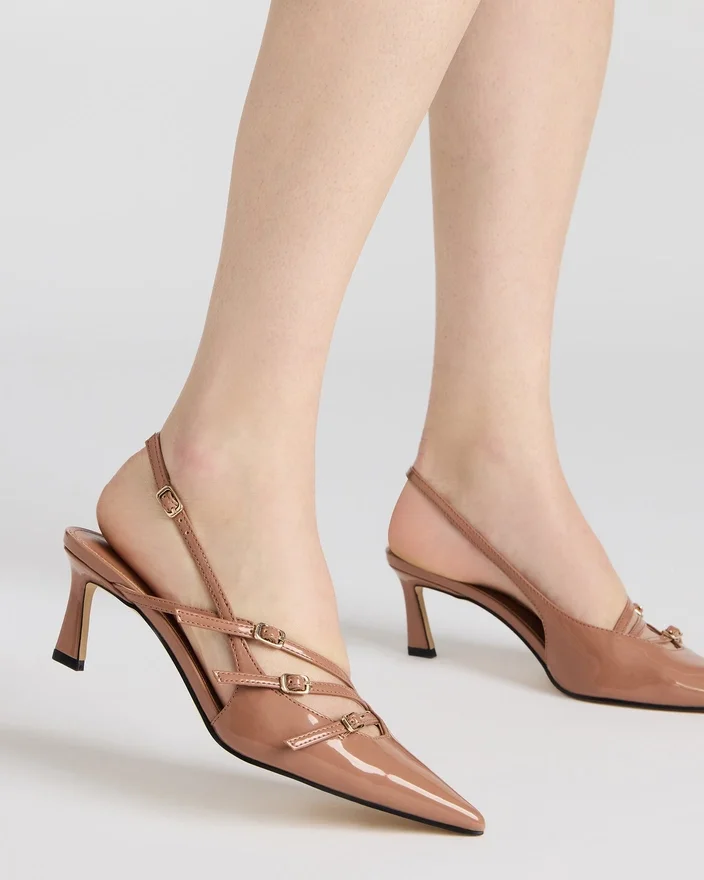 Offrez-vous un peu de luxe avec les Slingbacks à bride arrière Liana. Avec leur talon bas et leur bout pointu, ces chaussures respirent l’élégance. Le design à brides sur le devant ajoute une touche de sophistication, tandis que le cuir verni rehausse l’ensemble.