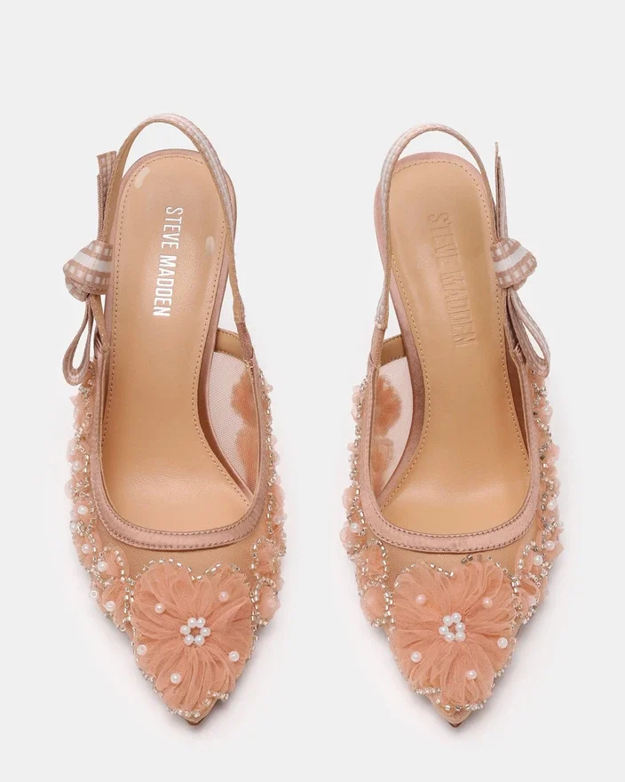 Un ruban gros-grain s’enroule autour de la bride arrière de l’escarpin à bout pointu et talon aiguille Bri Mesh Blush et se termine par un nœud qui rehausse le côté de la chaussure.