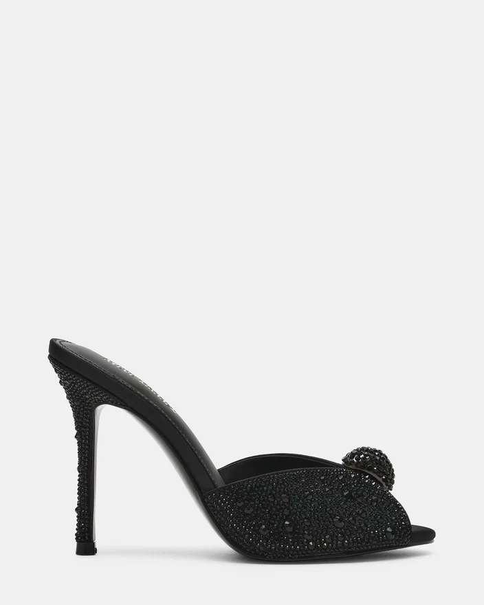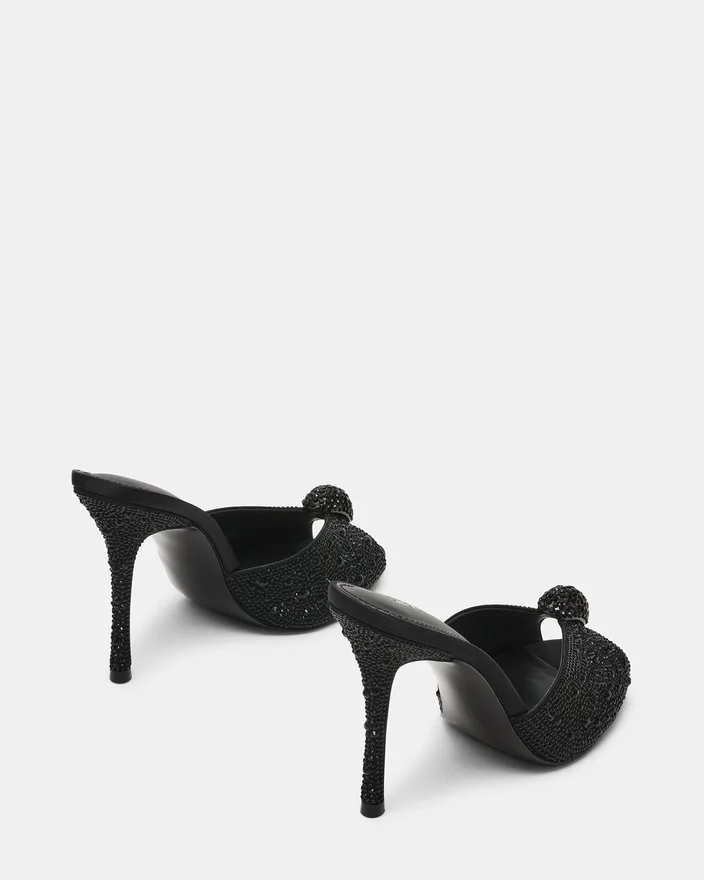 La sandale Priya Black Rhinestones associe un talon aiguille fin à une bride avant en maille transparente à bout ouvert, parsemée de mini-strass qui scintillent et brillent à chaque pas.
