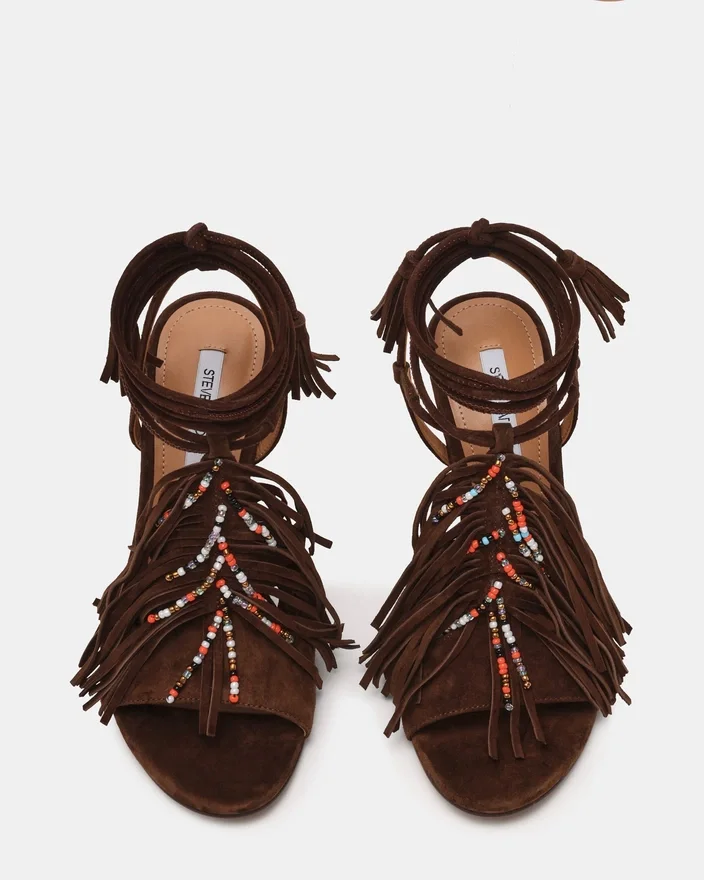 L’escarpin à talon aiguille Talia en daim marron allie un design architectural à des ornements luxueux. Le mouvement des franges en cascade ajoute une texture dynamique, rehaussée par des détails de perles complexes qui captent la lumière à chaque pas. Le talon aiguille raffiné offre à la fois hauteur et élégance, ce qui en fait un choix incontournable pour celles qui apprécient le savoir-faire sophistiqué en matière de chaussures. Parfait pour les occasions exigeant un style remarquable et une finition raffinée.