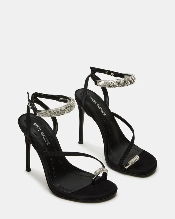 Adoptez un look stylé avec les escarpins à talons aiguilles Tia Rhinestones en satin noir. Avec leurs audacieuses finitions dorées et leur design à lanières, ces chaussures rehausseront n’importe quelle tenue. Libérez votre audace et partez à la conquête de la journée avec ces talons qui ne passent pas inaperçus !