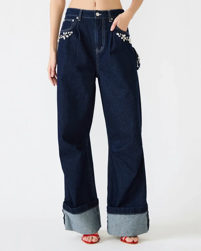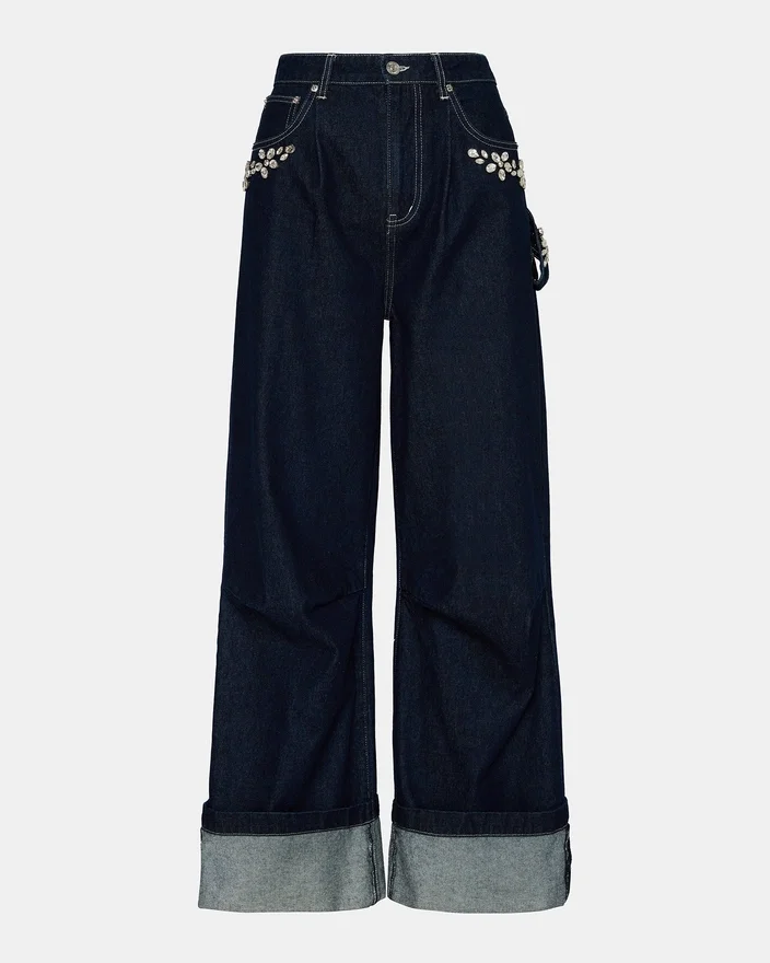 - Silhouette à jambes larges et décontractées offre confort et style, tandis que ses détails scintillants font de ce jean une pièce incontournable, parfaite pour un look habillé ou décontracté. Une version moderne du jean classique qui apporte éclat et sophistication à votre garde-robe.