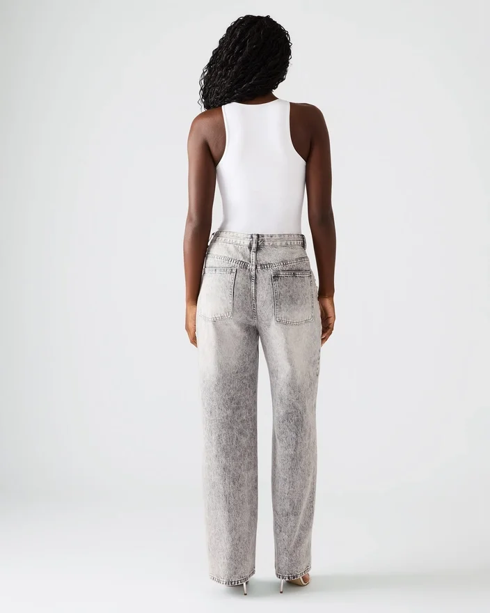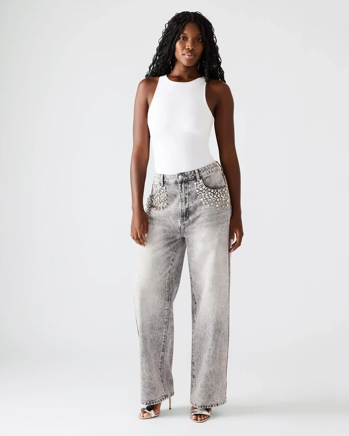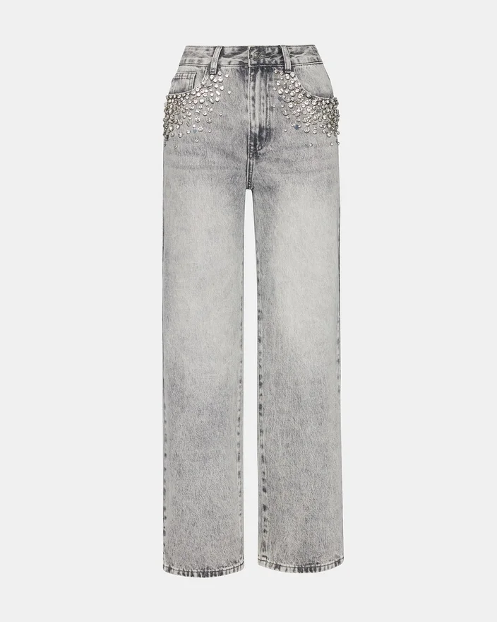 Le jean Eras se caractérise par une coupe droite sophistiquée, rehaussée de délicats strass qui lui confèrent un éclat subtil.