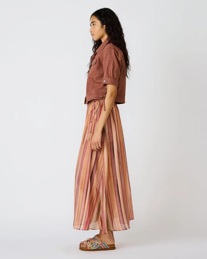 La jupe Shilloh à rayures multicolores allie une élégance naturelle à une touche contemporaine. Cette jupe longue présente une silhouette gracieuse et fluide, rehaussée par des rayures multicolores vives qui ajoutent de l’intérêt visuel et du mouvement. Son drapé décontracté crée une coupe flatteuse et confortable, parfaite aussi bien pour les sorties décontractées que pour les occasions habillées. Suffisamment polyvalente pour être associée à des basiques simples ou à des hauts originaux, cette pièce passe sans transition d’une tenue de jour à une tenue de soirée. Un ajout indispensable à toute garde-robe en quête d’un style sophistiqué et d’un charme moderne.