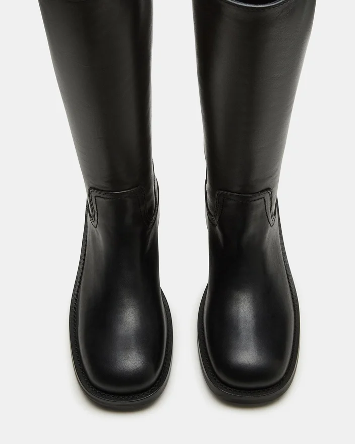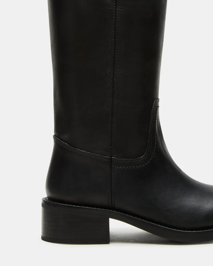 Rehaussez votre style en toute simplicité avec la botte Riggs en cuir noir à mollets larges. Avec son bout carré et son design épuré, cette botte arrivant juste sous le genou est un incontournable pour toute personne soucieuse de la mode. Intemporelle, elle allie confort et élégance, ce qui en fait le complément idéal de n’importe quelle tenue.