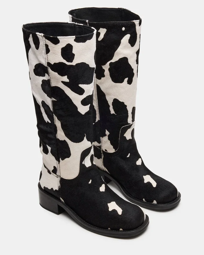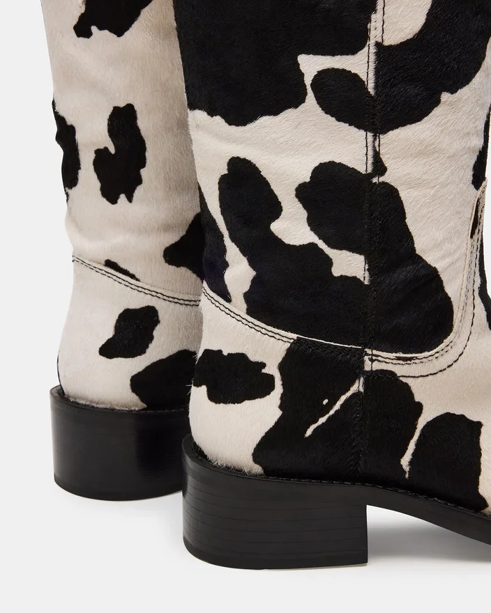 Rehaussez votre style sans effort avec la botte Riggs à imprimé vache noire et bottes mollets larges. Avec son bout carré et son design élégant, cette botte arrivant juste sous le genou est un incontournable pour toute personne soucieuse de la mode. Cette botte intemporelle offre à la fois confort et sophistication, ce qui en fait le complément parfait à n’importe quelle tenue.
