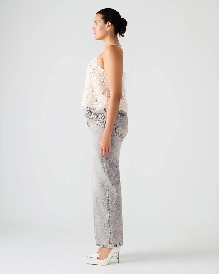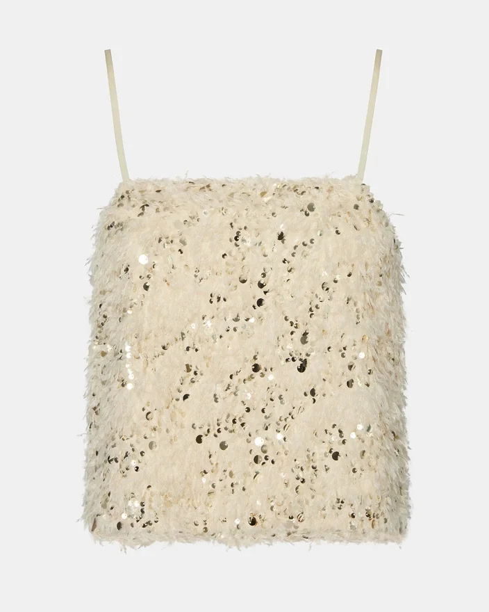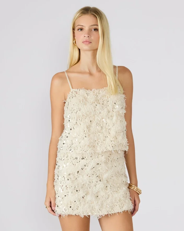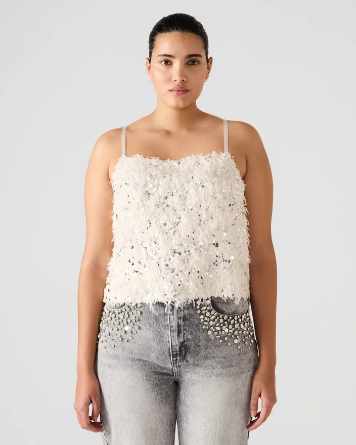 Rehaussez votre tenue avec le haut à plumes Blakelyn ivoire, un modèle sans manches orné de délicats détails en plumes et de paillettes scintillantes. Parfaitement conçu pour faire partie d’un ensemble coordonné, ce haut apporte de la texture et un éclat subtil, idéal pour les occasions sophistiquées ou les tenues de soirée élégantes.