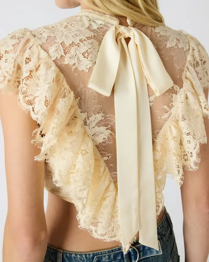 Le haut Faya Tropic Sands associe une délicate construction en maille et dentelle à une silhouette courte flatteuse. Les manches flottantes ajoutent du mouvement et de la dimension, tandis qu’un nœud raffiné dans le dos rehausse le design d’une élégance discrète. Parfait pour être superposé ou porté seul, ce vêtement apporte une féminité raffinée à toute garde-robe estivale.