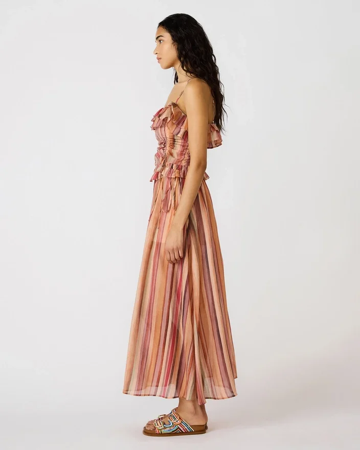 Le haut Shilloh à rayures multicolores allie un design contemporain à des détails ludiques. Cette silhouette sans manches présente des rayures multicolores vives qui créent un intérêt visuel, tandis que de délicats volants ajoutent de la dimension et du mouvement. La coupe experte assure un ajustement soigné qui s’adapte parfaitement de la journée à la soirée.
