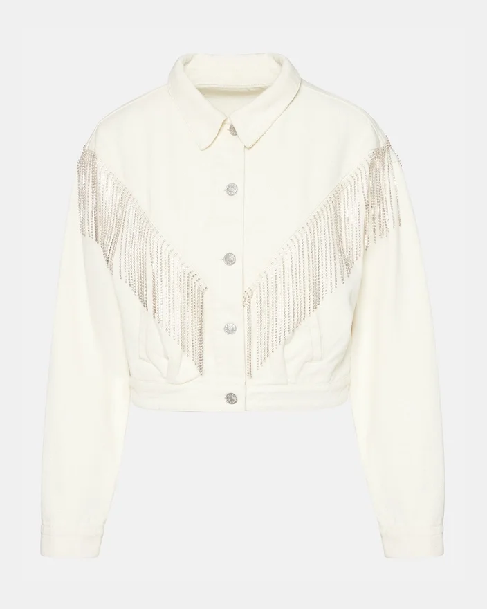 Confectionnée avec soin, la veste en jean Canyon est un incontournable de toute garde-robe. Cette veste en jean courte est ornée de franges en strass raffinées pour une touche de style Western, tandis que la fermeture à boutons assure un ajustement parfait.