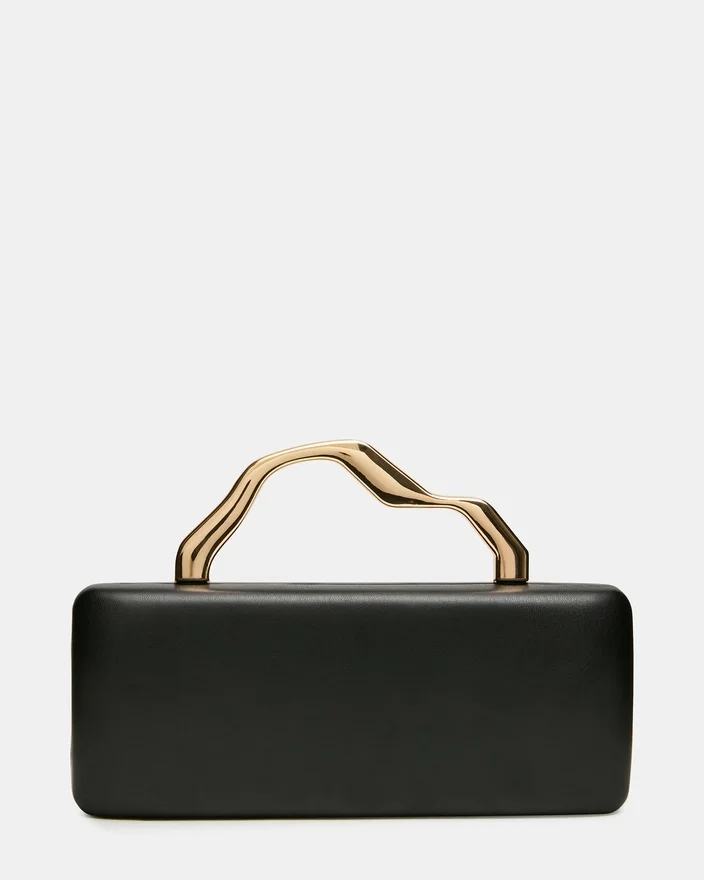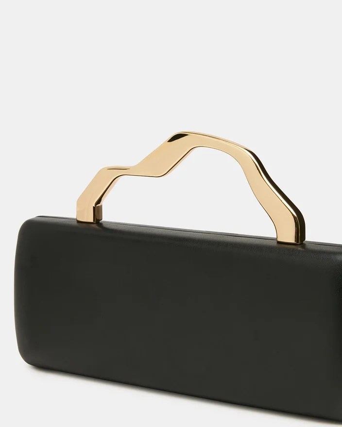 Le sac Leena noir présente une silhouette sophistiquée rehaussée par des poignées dorées luxueuses qui captent la lumière à chaque utilisation. Cette pochette polyvalente passe sans transition de la journée à la soirée, offrant une élégance raffinée sans compromis.