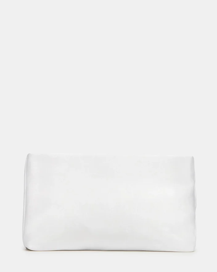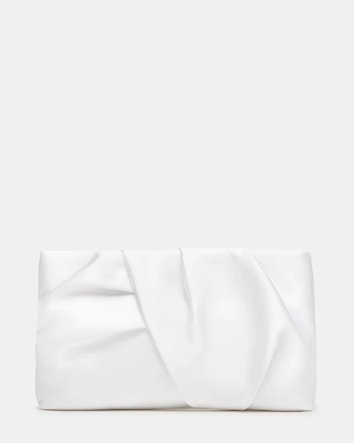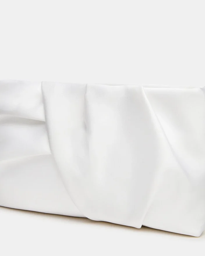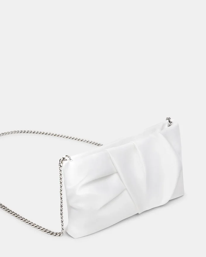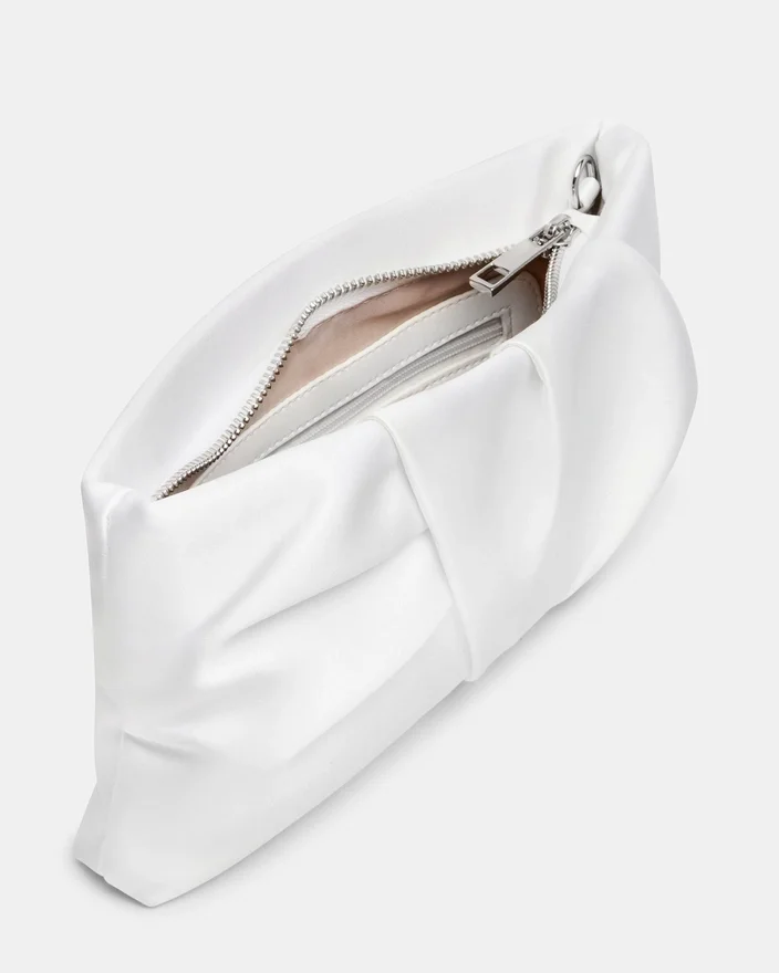 Le sac Lilia blanc met en valeur un savoir-faire raffiné grâce à sa silhouette allongée et ses détails plissés à la main. Confectionnée dans un somptueux tissu satiné, cette pochette offre une expérience tactile luxueuse grâce à son drapé doux et fluide. La fermeture à glissière métallique sur le dessus garantit un rangement sécurisé, tandis que l’organisation intérieure bien pensée permet d’accéder facilement à l’essentiel. La bandoulière amovible en chaîne offre une grande polyvalence : portez-le en pochette pour vos soirées ou en bandoulière pour avoir les mains libres. Un accessoire sophistiqué qui passe sans effort du jour à la nuit.