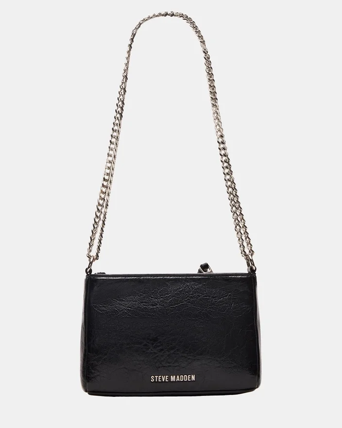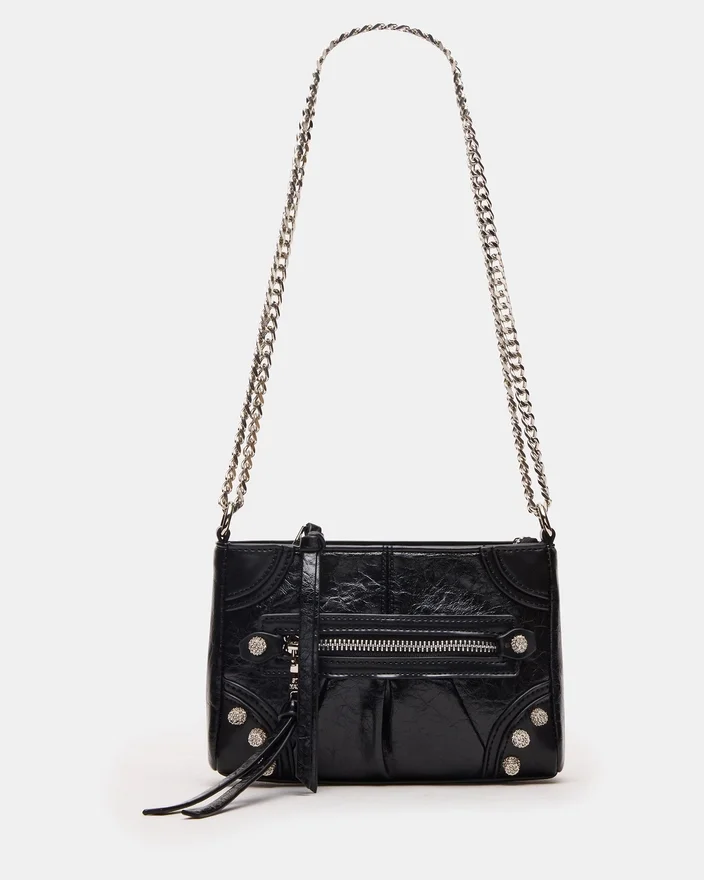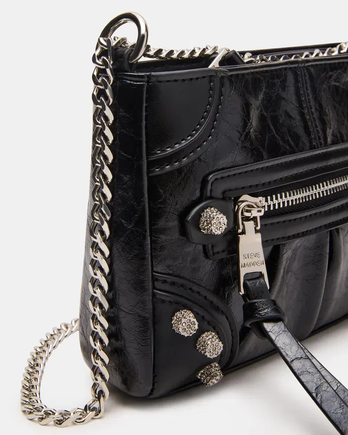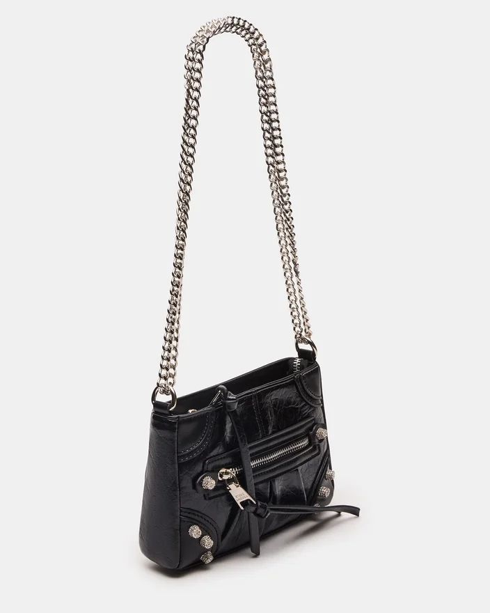 Ce mini sac Sky noir/argent est un sac à bandoulière d’inspiration moto qui allie un design audacieux à des détails raffinés. Doté d’un corps noir élégant orné de clous en strass scintillants, il ajoute une touche de glamour à n’importe quelle tenue. La bandoulière en chaîne offre à la fois durabilité et contraste sophistiqué, ce qui en fait un accessoire idéal pour avoir les mains libres sans compromettre le style. Parfait pour transporter l’essentiel avec une touche moderne et avant-gardiste.<!–